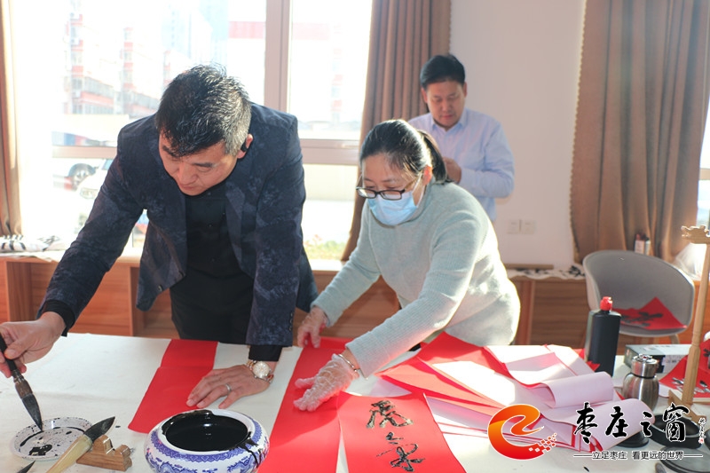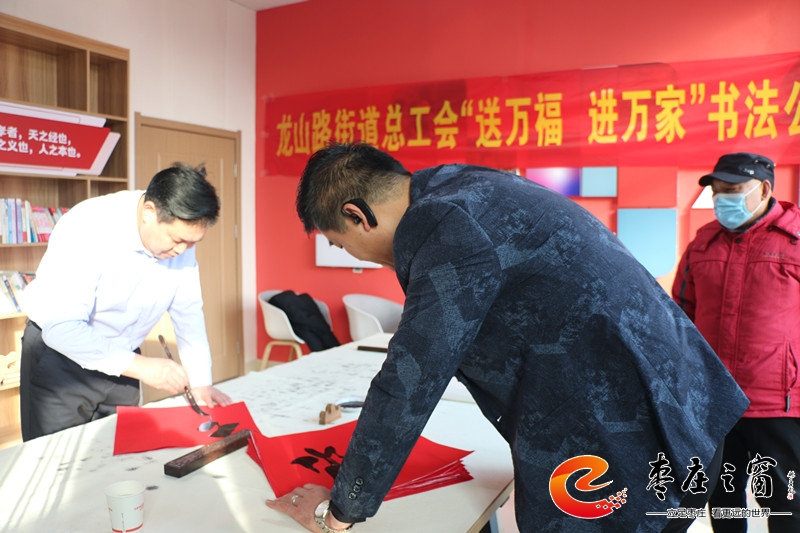 “給大家送‘!玻 卑殡S著新年的祝福,龍山路街道總工會的工作人員們正將書法家們寫好的一張張福字雙手遞給在場的職工。1月16日上午,市中區(qū)龍山路街道總工會在公勝街紅色驛站組織開展“送萬福 進萬家”書法公益活動,邀請省書法家協(xié)會的4位書法家代表,在活動現(xiàn)場手寫福字和對聯(lián),為廣大職工群眾以及轄區(qū)企業(yè)送去新春的祝福和問候。